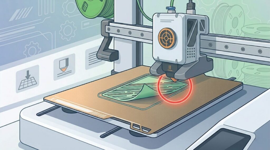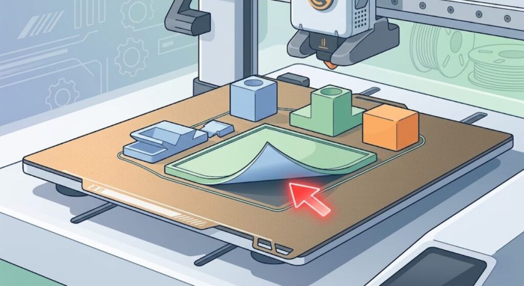 印刷を開始しても、造形物がビルドプレートにくっつかず、途中で剥がれたり反ったりするトラブルです。3Dプリンター初心者が最も遭遇しやすいトラブルの一つです。