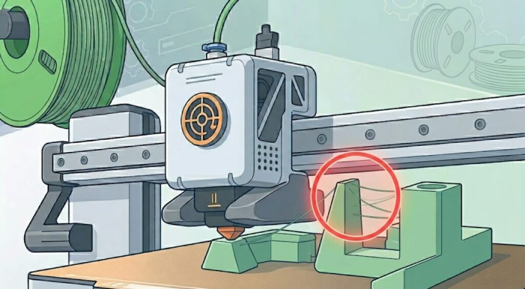 造形物の表面に蜘蛛の糸のような細い糸が無数に付着するトラブルです。見た目が悪くなり、後処理の手間が増えます。