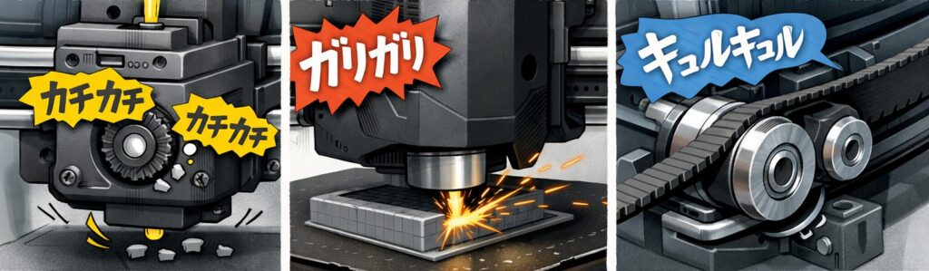 異音の大半はノズル詰まりかキャリブレーションのズレが原因だよ。慌てずに音の種類を聞き分けるのがポイント!