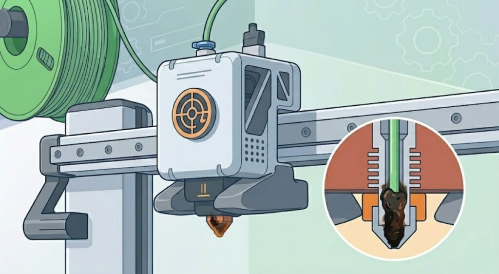 印刷中にフィラメントが押し出されなくなり、造形物がスカスカになったり、途中から何も出力されなくなるトラブルです。