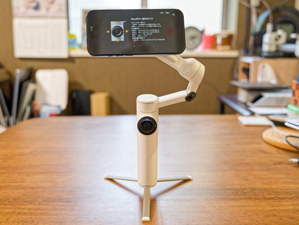 「Flow 2 Pro」には三脚と5段階の長さ調節が可能な自撮り棒が内蔵されており、ユーザーの多様な撮影シチュエーションに対応することができます。