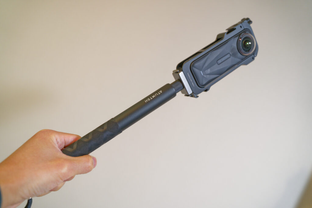 マウントにポール(カーボン製の細い棒)を装着し、ポールの先端に360°カメラを取り付けることで、ハンズフリーのドローン視点撮影が可能になる仕組みです!
